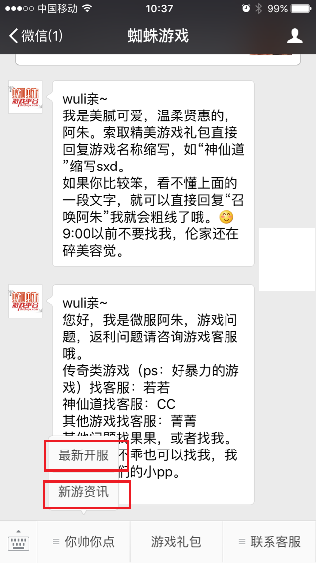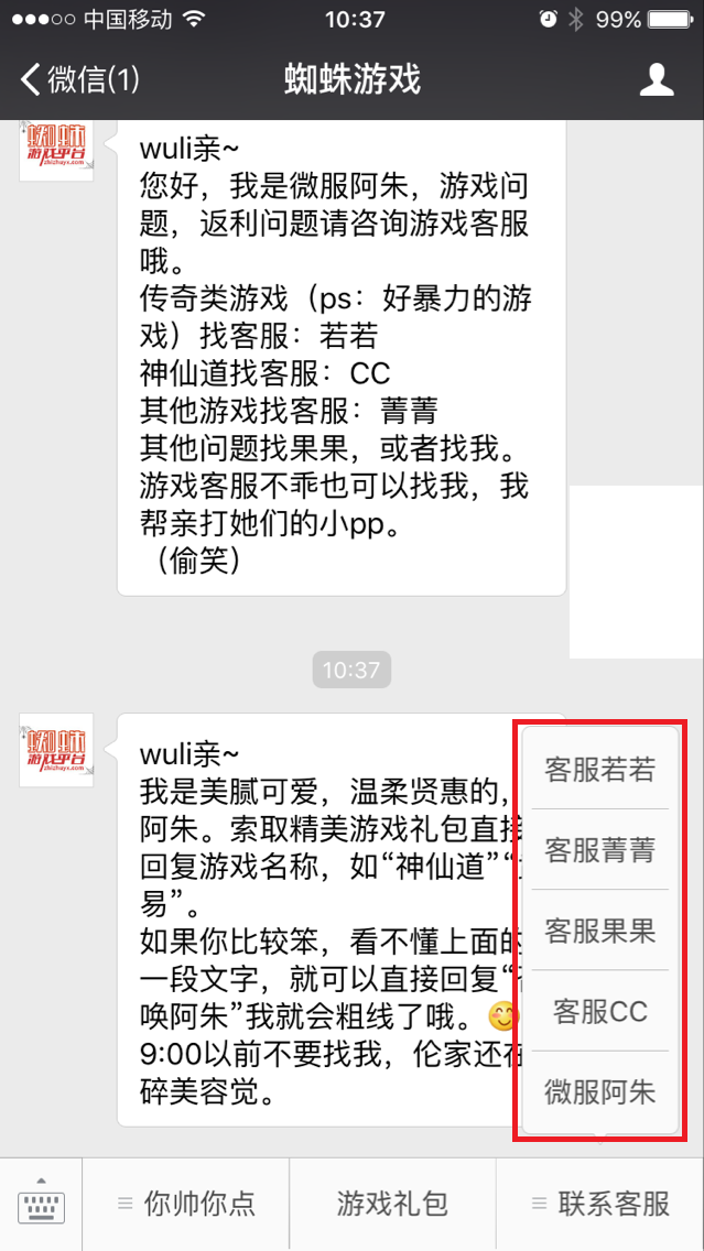 “蜘蛛游戏”微信公众号的开通,为玩家提供了更多的福利待遇,也会陆陆续续的在微信公众平台开展各种具有平台特色的活动。蜘蛛微信客服“阿朱”我们微信公众号的专属客服,有什么问题都可以在微信公众号里面直接召唤阿朱。