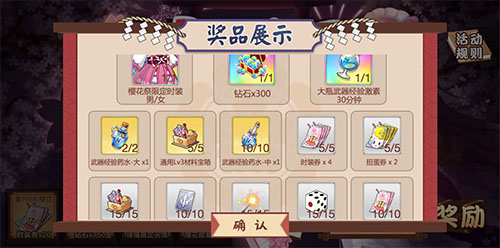 在活动期间,每进行一次抽奖,随机获得奖励栏中的一项奖励。包括樱花祭限定时装、钻石、宝箱、时装券等等。完成的任务越多,获得的抽奖次数越多,收获也就越丰富哦!当拥有的樱花印记达到指定数量时,还可领取额外的阶段奖励。