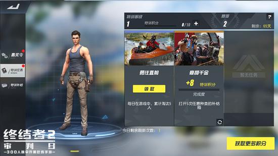 特训手册由特训任务,嘉奖令和特训补给三部分组成。特训任务是玩家需要完成的挑战,如单日累计淘汰五人、打开五个补给箱等等,完成任务可获得积分,提升特训等级。