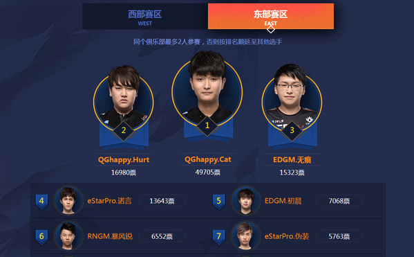 西部赛区前七位QG猫神、QG刺痛、EDGM无痕、eStar诺言、EDGM初晨、RNGM暴风锐和eStar伪装,其中前三得票数分别为猫神49705票、刺痛16980票和无痕15323票!
