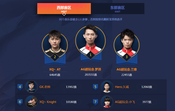 西部赛区前七为AG梦泪、XQ阿泰、AG兰息、GK老帅、Hero久诚、XQKnight和AG小飞,其中前三得票数分别为梦泪203555票、阿泰64645票和兰息22455票!