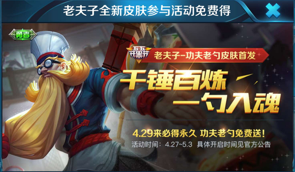 如今,王者荣耀将在两天后正式上线一系列开黑节主题活动,其中老夫子全新勇者皮肤确认名为功夫老勺,通过官宣图也已经得知获取该皮肤的活动时间为4月27日至5月3日,并且本周日(29号)登录必得免费永久皮肤,想要这款非卖皮肤的玩家别忘了参与哦!