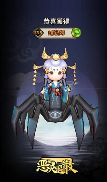 在《恶灵退散》里,对“络新妇”的形象进行了萌化。紫色的头发、大大的眼睛、华丽的发饰与服装仍能看出美女的模样,加上下半身的毒蜘蛛形象,完美地诠释了络新妇邪性之美。