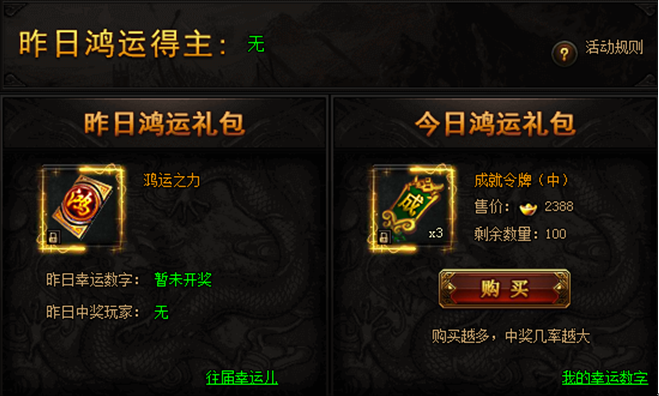 活动期间,购买限购礼包赢取幸运大奖,奖励极品限时称号。(全服限量买到即赚到)购买礼包越多,中奖几率越大!