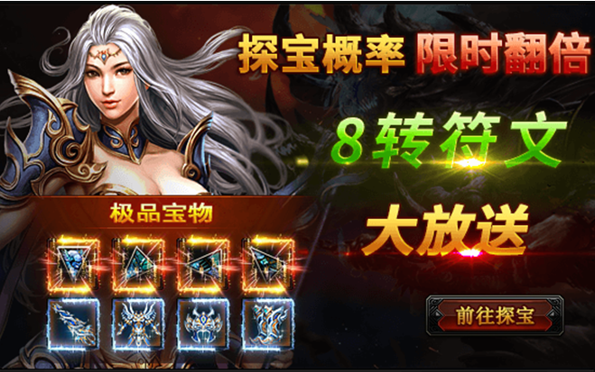 活动期间内,探宝概率翻倍;并有较大概率获得8转符文、高转装备、霸王神装、等极品道具!