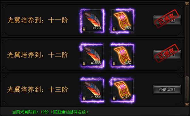 活动期间内,光翼达到指定要求即可领取大奖!每项奖励每人仅限领取1次!