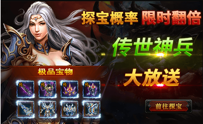 活动期间内,探宝概率翻倍;并有较大概率获得传世神兵、高转装备、霸王神装、等极品道具!