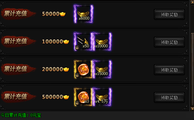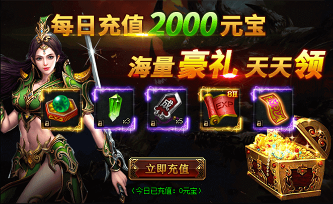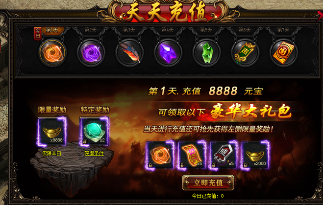活动期间内,每日累计充值指定金额元宝即可领取奖励!!!(温馨提示:不同日期奖励不一样哦,具体奖励以游戏内为准)