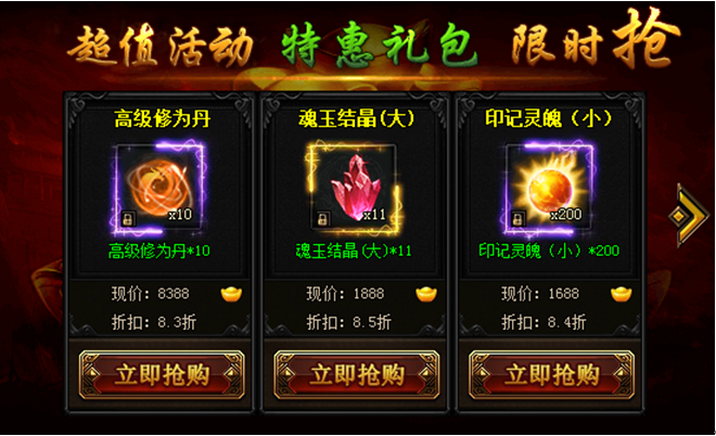 活动期间,可购买超优折扣每日限购礼包,高级修为丹、印记灵魄、探宝符、羽毛、魂玉结晶、护盾结晶、暗器结晶、成就令牌、声望令牌等极品道具仅限活动期间跳楼优惠!