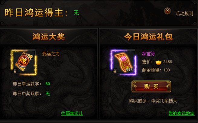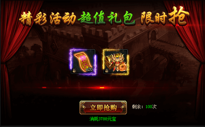 活动期间,购买限购礼包赢取幸运大奖,奖励极品限时称号。(全服限量买到即赚到)购买礼包越多,中奖几率越大!