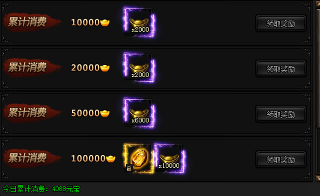 活动期间内,每日累计消费指定金额元宝即可领取奖励!!!(温馨提示:最高奖励是符文重置石)