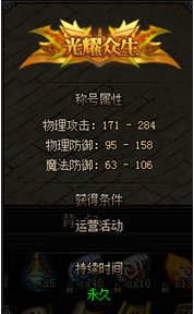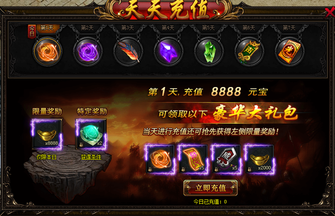 活动期间,开放天天充值活动,活动期间充值达到指定金额可以领取超值大奖。累计7天充值达到指定金额可以领取绝版酷炫强力称号:光耀众生