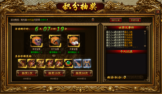 活动期间,开放积分探宝活动,充值可以领取积分进行探宝,探宝可以获得大量超稀有装备和材料。活动每天产出限量传世宝箱、9转符文宝箱、天蚕丝宝箱,数量有限,先到先得喔!