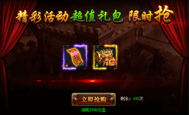活动期间,购买限购礼包赢取幸运大奖,奖励极品限时称号。(全服限量买到即赚到)购买礼包越多,中奖几率越大!