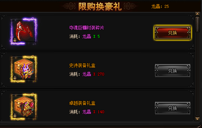 活动期间内,进行幸运探宝有一定概率获得龙晶。可以使用龙晶兑换下列极品奖励!