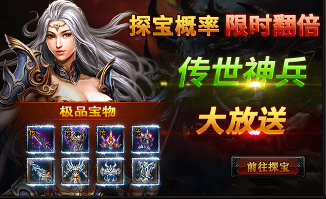 活动期间内,探宝概率翻倍;并有较大概率获得传世神兵、高转装备、霸王神装、等极品道具!