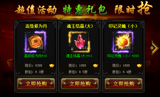 活动期间,可购买超优折扣每日限购礼包,高级修为丹、印记灵魄、探宝符、羽毛、魂玉结晶、护盾结晶、暗器结晶、成就令牌、声望令牌等极品道具仅限活动期间跳楼优惠!