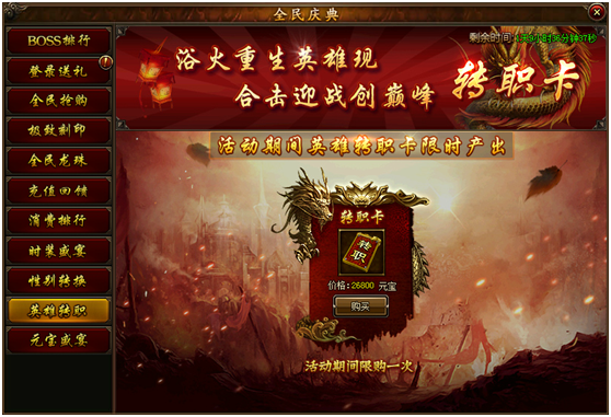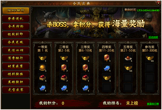 【活动说明】活动期间,击杀任意BOSS均可掉落BOSS积分卡,使用后可获得BOSS积分,根据BOSS积分排行可获得不同的排行奖励,排行奖励在活动结束时以邮件的方式进行发放