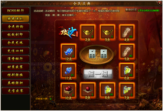 【活动说明】登陆游戏即可免费投掷筛子一次,根据投掷筛子的点数来获得奖励