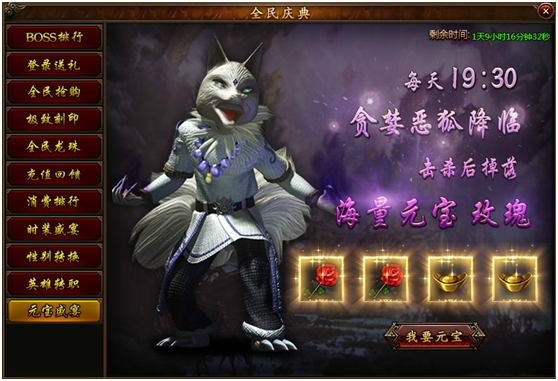 【活动说明】:活动期间每天19:30刷新贪婪恶狐,击杀后掉落海量不绑定元宝;