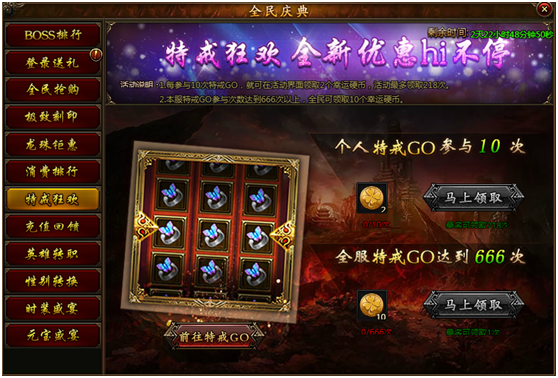 【活动说明】活动期间,每参与10次特戒GO,就可在活动界面多领取2个幸运硬币,升阶特戒,8折优惠!更有全服特戒狂欢,本服特戒GO参与次数达到666次以上,全民可免费领取10个幸运硬币。