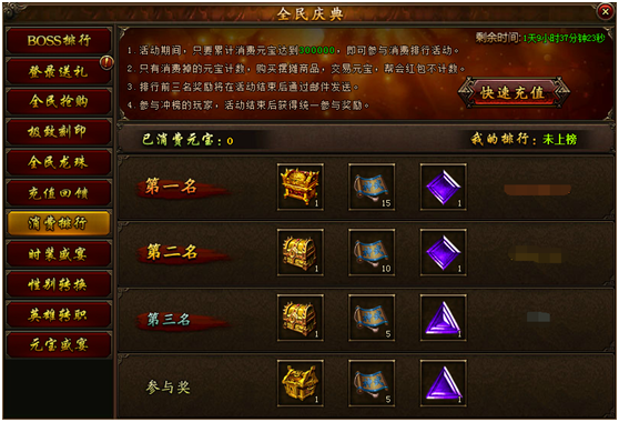 【活动说明】活动期间,累计消费达到300000元宝即可参与充值排行活动,排行前三名的玩家可获得专属奖励,其他达到充值条件的玩家可获得参与奖,活动奖励在活动结束时以邮件的方式进行发放